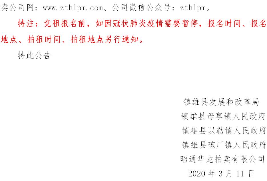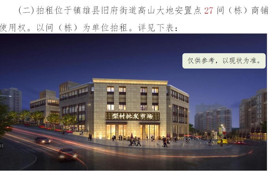 經(jīng)鎮(zhèn)雄縣人民政府批準(zhǔn),受相關(guān)部門(政府)委托,公開拍租位于鎮(zhèn)雄縣易地扶貧搬遷工程呢嚕坪安置點(diǎn)7棟獨(dú)立商鋪使用權(quán)、高山大地安置點(diǎn)27間(棟)商鋪使用權(quán)、魯家院子安置點(diǎn)24間(棟)商鋪使用權(quán)、母享安置點(diǎn)146間商鋪使用權(quán)、以勒物流城安置點(diǎn)67間(棟)商鋪使用權(quán)、碗廠安置點(diǎn)114間商鋪使用權(quán)。相關(guān)事項(xiàng)如下: